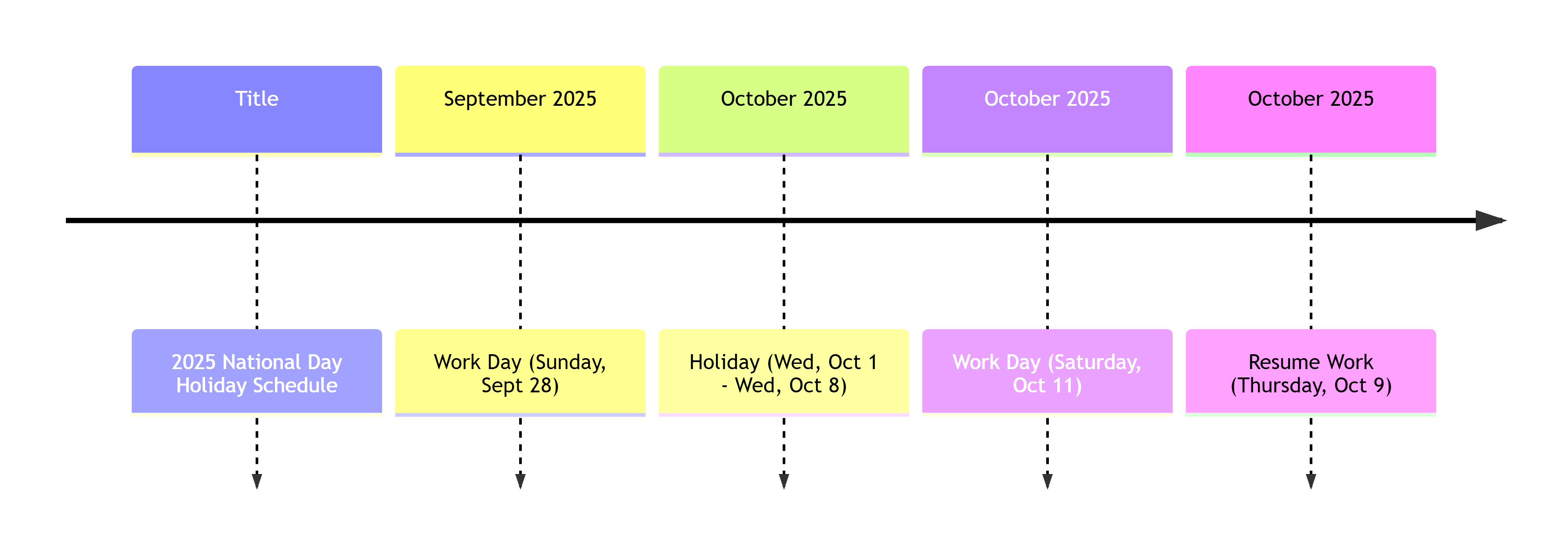 Tidslinjen nedenfor skitserer de vigtigste datoer omkring ferieperioden:图表代码ℹ️ Operationelle arrangementer I løbet af ferien vil vores kontor være lukket, og der vil ikke være nogen tilgængelig til at modtage opkald eller behandle standardforespørgsler. For alle presserende sager, der kræver øjeblikkelig opmærksomhed, bedes du kontakte din udpegede repræsentant direkte via deres mobiltelefon eller e-mail. Vi vil gøre vores bedste for at løse kritiske problemer hurtigt.