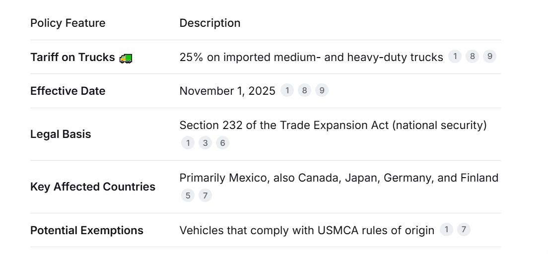 3) Lastbiler, der opfylder USMCA-oprindelsesreglerne (USA-Mexico-Canada-aftalen), som kræver en vis procentdel af det nordamerikanske indhold, kan blive undtaget fra den nye tarif.